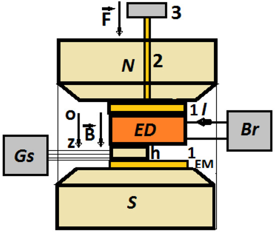 Experimental set-up (overall configuration): EM—electromagnet; N and S—magnetic poles; Br—impedance meter; Gs—gaussmeter; h—Hall probe; B—magnetic flux density vector; F—gravity force; ED—electrical device; 1—non-magnetic plate, 2—non-magnetic spindle, 3—non-magnetic weight.