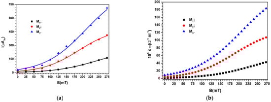 (a) The intensity, I, of the electric current through the devices , depending on the B values of the magnetic flux density (points—experimental data, lines—polynomial fits); (b) The electrical conductivity σ of the membranes depending on the B values of the magnetic flux density.