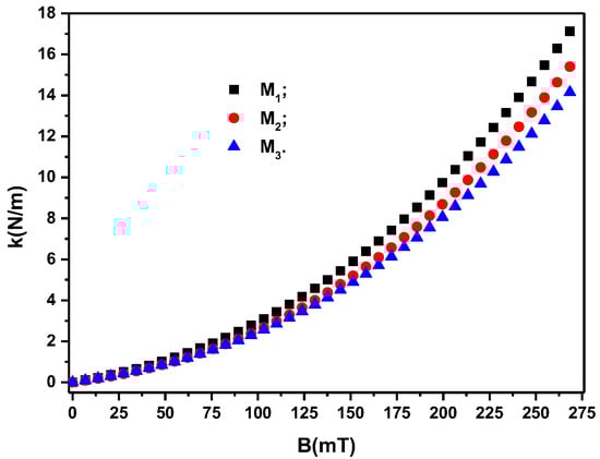 It can be seen from Figure 9 that the quantities appear when a magnetic field is applied. Their value depends on the surface area of the membranes and on the volume fractions of the magnetic dipoles, . On the other hand, for the same membrane geometry and the same values of , the values of depend significantly on the density of the magnetic flux, B. In addition, from Figure 9, it can be seen that by adding silver microparticles, such as in the case of membranes and , and reducing the volume fraction of microparticles CI (see Table 3), the value of k decreases relative to that of membrane for the same values of B. This result suggests that we can consider the columns of dipoles as chains arranged in an orderly manner in the volume of the membranes . The stiffness of the chains is dependent on the volume fraction of the magnetic dipoles and the values of the magnetic flux density B. This result suggests that we can consider the columns with chain dipoles as being arranged in an orderly manner in the volume of the membranes , as reported in [28] for magnetorheological elastomers.
