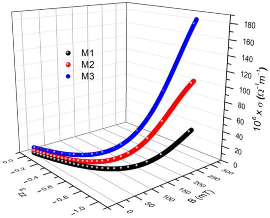 We insert the from Figure 8a into Equation (14) to obtain . For each value of the magnetic flux density, B, there are corresponding components of the deformations and values of the electrical conductivity in Figure 8b. Similar results were reported for the case of magnetorheological elastomers [29,30], and for hydrogels [31]. The deformations correspond to the electrical conductivity values from Figure 8b, at the same value as the magnetic field density, B. The σ values are due to the electronic conduction achieved through the tunnel effect [27,32]. As reported in [27,32], by increasing the values of the magnetic field density, B, the height of the electrical potential well decreases so that the electrons from lower energy levels can pass over. The effect is the increase of electrical conductivity with the increase of B. Through the 3D representation of the coordinate points (B, σ, ), we obtain , as shown in Figure 10.