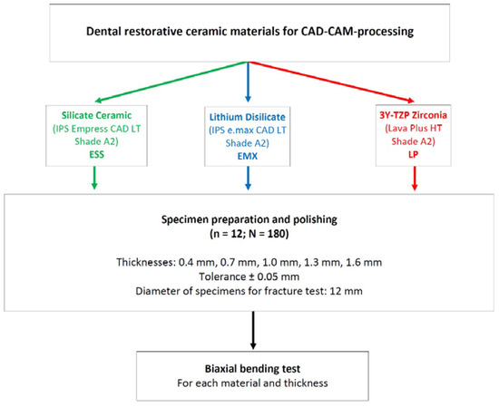 The present study examined a leucite-reinforced silicate ceramic (IPS Empress CAD (“ESS”), Ivoclar Vivadent, Schaan, Liechtenstein), a lithium disilicate ceramic (IPS e.max CAD (“EMX”), Ivoclar Vivadent, Schaan), and a 3Y-TZP oxide ceramic (Lava Plus (“LP”), 3M, Seefeld, Germany) (Table 1).