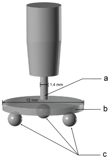 Schematic drawing of the biaxial bending test (DIN EN ISO 6872) (a. steel piston; b. test specimen; c. supporting spheres placed in a circular manner at 120° from each other).