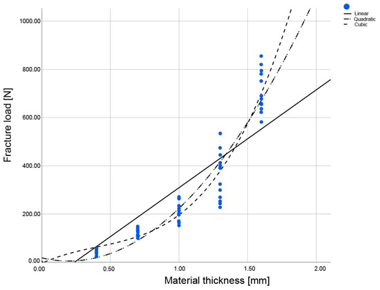 To improve the significance of the R2 fit and, hence, the curve itself, the number of supporting points could be further increased. In the present study, this was implemented with six support points (0.0, 0.4, 0.7, 1.0, 1.3, and 1.6 mm). A standardized manual control mechanism was applied to ensure that the standard deviations within the measurement series were kept to a minimum, which probably had a positive impact on the fit of the curves. The smaller the standard deviations in the fracture load tests, the fewer support points are theoretically needed to determine the material-specific cubic coefficients. In theory, the zero point and three other thickness values would suffice to determine the material-specific fracture load coefficients. The method of least squares was used to determine the regression curves, minimizing the deviation error between the measurement points and the regression curve. The regression curve obtained was the one that had the smallest deviation error considering all the measured points.