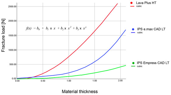For the LP, the fit was identical for the quadratic and cubic regression curves; for the ESS and EMX, the cubic curve exhibited the best alignment (R2) (Figure 4, Figure 5 and Figure 6, Table 3). Thus, the cubic regression curves most accurately described the fracture load values within the thicknesses from 0 mm to 1.6 mm, for the materials investigated (Figure 7). Using the resulting material-specific fracture-load coefficients b0, b1, b2, and b3 (Table 4) and the cubic fracture-load equation, the fracture load of the materials can be calculated for any individual material thickness.