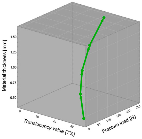Previously, it was shown that the transmission of light in dental ceramics depends logarithmically on the material thickness [9]. Combining the findings obtained in the present study with the results from an evaluation of translucency leads to a three-dimensional regression curve, representing a relationship between the fracture load and the translucency of a given material dependent on its thickness (Figure 8). This could provide additional insights with regard to material selection and help optimize the choice of materials for practical application.