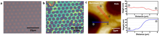 Multilayer HTC on graphene. (a) Pristine graphene. The holes were made by photolithography, (b) heat treatment at 100 °C for 20 min after coating with multilayer HTC on graphene, and (c) AFM image and height information of coated with multilayer HTC on graphene.