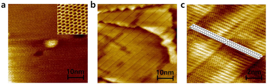 Alkane molecules, hexatriacontane (HTC), were deposited on patterned graphene in order to confirm that hydrophobic molecules prefer to be deposited on only a hydrophobic graphene surface rather than hydrophilic graphene defects as shown in Figure 3. HTC would make self–assembled layers on graphene whenever HTC solution is replaced on graphene surface due to enough stabilization energy from van der Waals interactions from HTC–HTC and HTC–graphene. In the solution, HTC molecules prefer to randomly exist due to the thermodynamic rule of entropy increase. However, when HTC makes a van der Waals contact with the graphene surface, HTC would be nucleated on graphene due to strong van der Waals interaction and start to make a self–assembled monolayer [24]. Because the enthalpy reduction from HTC molecules in a self–assembled monolayer and HTC–graphene contact overcomes the barrier of entropy, Gibbs free energy turns to negative, allowing the formation of an HTC monolayer on graphene surface even in the solution, as shown in Figure 4. The synthesized CVD graphene surface and zoomed–in graphene honeycomb structure (inset) is shown in Figure 4a. Under the HTC solution, a self–assembled HTC monolayer is visualized using STM. The steps originate from the crystalline copper surface and the lines are from the columnar structure of alkanes (Figure 4b). The zoomed–in image shows that alkane molecules are stacked by forming the columnar structure through van der Waals interactions (Figure 4c). The slow evaporation of the solvent would lead to three–dimensionally stacked HTC films on graphene. Interestingly, this phenomenon would not occur on amorphous SiO2 surface. The lack of a strong van der Waals interaction between HTC and surface leads to HTC molecules not being nucleated on the amorphous SiO2 surface in the early nucleation stage. Therefore, it was expected that HTC would only be deposited on patterned graphene and not on the amorphous SiO2 surface. This hypothesis is experimentally demonstrated using patterned graphene. The graphene has periodically aligned 5 μm defects as shown in Figure 3a. On this graphene, HTC was deposited through slow evaporation of heptane solution (Figure 3b). After the deposition, the thickness and morphology of HTC films on graphene were investigated using AFM as shown in Figure 3c. The initial height from SiO2 to graphene before the deposition was measured as ~2 nm through the non–contact mode of AFM (Figure 2b). After the deposition, the thickness of the HTC film was 60 nm (Figure 3c blue line) and the morphology became much smoother than that of the graphene surface (Figure 3c red line). Interestingly, as shown in Figure 3b, HTC was only deposited on the graphene surface rather than in defects. This result supports the hypothesis that hydrophobic molecules prefer to be deposited on a hydrophobic graphene surface, presumably due to hydrophobic–hydrophobic interactions. In other words, hydrophilic defects might be filled with hydrophilic molecules through hydrogen–bonding interactions.