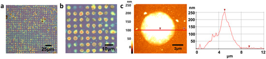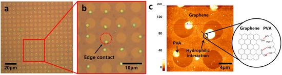 In order to prove the hypothesis that hydrophilic–hydrophilic interaction between PVA and defects allows selective deposition, the initial growth of PVA was investigated before completing deposition. As shown in Figure 5, PVA particles were only located at the defect edges at initial nucleation stages. Interestingly, no PVA particles were observed on the hydrophobic graphene surface, supporting the hypothesis that PVA prefers to interact with hydrophilic functional groups at defect edges such as carboxylic acid and hydroxyl group, as described in Figure 5c [35]. This result indicates that hydroxyl groups in PVA make hydrogen bonding with defective edges as described in Figure 5c. After completing the deposition of PVA, it was observed that PVA was periodically deposited only in graphene defects and not on graphene surface, as shown in Figure 6a. The enlarged image (Figure 6b) clearly shows that only defects are filled with PVA, although the height and shape of PVA are slightly different. The thickness and morphology of the deposited PVA were investigated using AFM (Figure 6c). The thickness was 250 nm and the mountain–like morphology was observed. The formation of this mountain–like morphology also indicates that PVA does not prefer to be deposited on the hydrophobic graphene surface. Therefore, the hydrophilic nature of defect edges and PVA, and the hydrophobic nature of the graphene surface allow PVA to be selectively deposited in graphene defects. This mechanism study of selective deposition of polymers in graphene defects would provide insights to the development of applications such as graphene–based gas barriers and various polymer nanocomposites.
