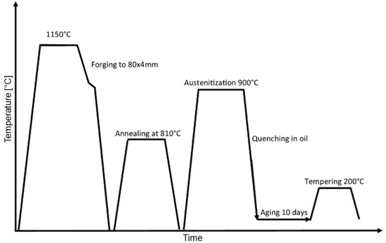 The ingots were reheated to 1150 °C and forged to final dimensions of 80 × 4 mm. After forging, the billets were cooled in air to room temperature, followed by annealing and final heat treatment by reheating to 900 °C and quenching in oil. After quenching, the billets were aged at room temperature for a period of 10 days in order to reduce the retained austenite fraction to below 1%, followed by tempering at 200 °C as depicted in Figure 1, after which a final hardness of 62 HRC was obtained.