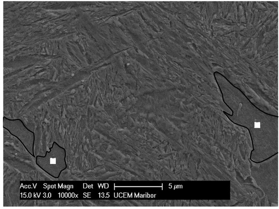 The regions where the bainite lath structure is notably finer correspond to the portion of retained austenite that transformed during natural aging and are marked with an square in Figure 3. The fine structure of the individual bainitic ferrite plates is shown in Figure 4.