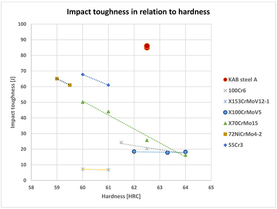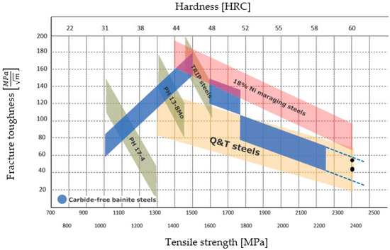 To put the current results into perspective, some data for fracture toughness KIC values in relation to Rockwell C hardness were plotted in Figure 11. The data were adapted from [20] and the available literature [21,22,23].