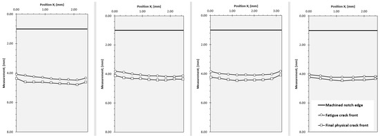 The crack front shape in the broken base metal SENB specimens showed that blunting occurred along the crack, such that it was curved more deeply in the center than the free edges of the cross-section (Figure 7). This is because the specimen affirms to plane-strain constraint conditions in the middle thickness and is less constrained towards the outer surfaces.