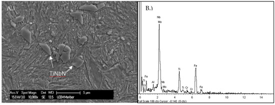 It is assumed that the observed non-metallic inclusions visible on the fracture surface correspond to clusters of TiNbN inclusions, as shown in Figure 10. These are thought to provide easy paths for crack propagation, and result in the apparently coarse fracture surface.
