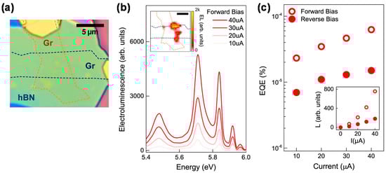 - Song, S.B.; Yoon, S.; Kim, S.Y.; Yang, S.; Seo, S.Y.; Cha, S.; Jeong, H.W.; Watanabe, K.; Taniguchi, T.; Lee, G.H.; et al. Deep-ultraviolet electroluminescence and photocurrent generation in graphene/hBN/graphene heterostructures. Nat. Commun. 2021, 12, 7134. [Google Scholar] [CrossRef]