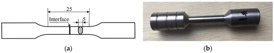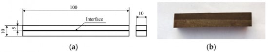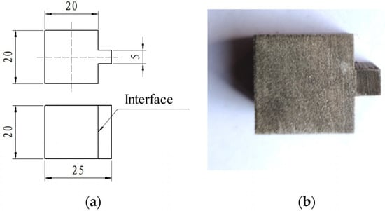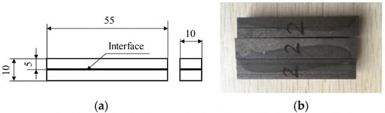 The interfacial bonding strength was determined using the shearing test. The schematic drawing and the physical photo of samples for the shear tests are shown in Figure 3. The bulges of shearing samples are the LAS, and the body is the HCCI. The force was loaded continuously on bulges until the fracture, while the body was supported using a special tool. A full-automatic Vickers hardness tester was utilized to measure the hardness. The total force of 1 kg was loaded onto samples and kept for 10 s. To evaluate the hardness variation, tests were performed nearby and across the interfacial region.