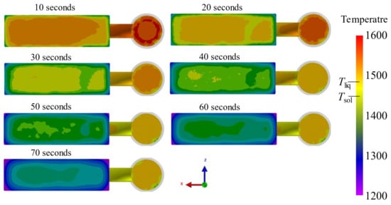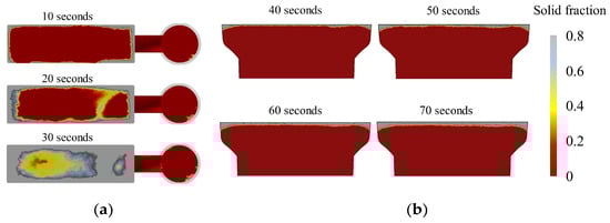 Simulation results regarding the interfacial solidification process of the bimetal are shown, respectively, in Figure 7 and Figure 8. The simulated temperature field results of the interface after the LAS casting (Figure 7) show that the temperature decreases from the center to the edges of the interfacial region. Although the temperature at the edges of the interfacial region after 10 s of pouring is lower than the solidification temperature, the temperature in the central area is far higher than the solid point. As the time interval increases, the temperature in the central area decreases. While the time interval is 40 s, the temperature of the whole interfacial region is lower than the solidification point. This means that the whole interfacial region has gone through solidification already. As the time interval further increases, the temperature of the central area decreases continuously. The temperature of the central area is below 1400 °C while the time interval is 70 s. To further show the interfacial solidification process, the solid fraction in the interfacial region for different time intervals was also calculated, and the results are shown in Figure 8. The solid fraction of the central area in the interfacial region of all samples with a time interval below 40 s is lower than that of the edges. While the interval is higher than 40 s, the whole interfacial region is solidified. This is in accordance with the simulated temperature field results. Furthermore, the thickness of the solidified layer increases with the time interval. When the interval is up to 70 s, the thickness of the solidified layer increases to approximately 5 mm. Previous results [,] have indicated that the second casting should be performed at the moment that the interface of the first casting has just reached full solidification. So, the simulation results indicate that the optimum pouring time interval of these bimetallic hammerhead castings is 40 s.