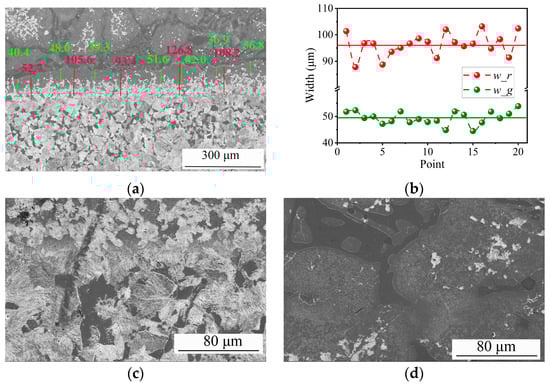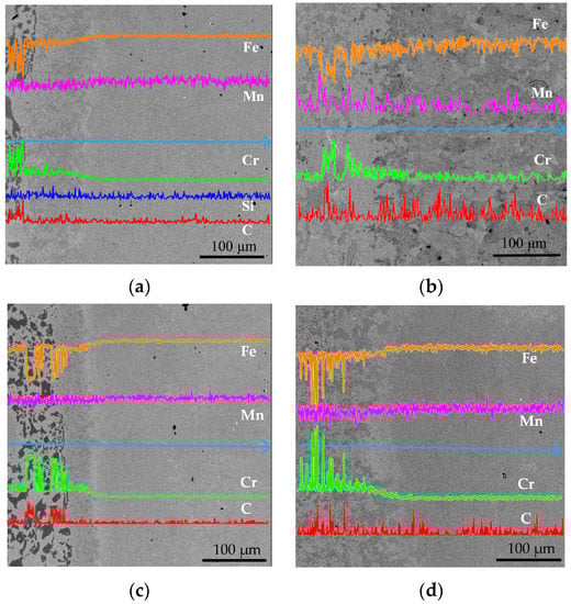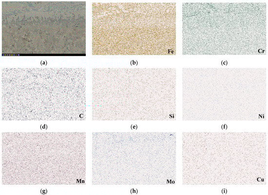 The microstructural images of the specimen produced by the optimum process (S2) are shown in Figure 13. The microstructure image in Figure 13a also shows an evident interfacial region between the LAS and HCCI regions. Clearer than the EDS image, two different zones can be observed in the interfacial region. These are a fine white precipitation zone and a gray zone that is named a carbide-free zone []. Two similar interfacial zones were also reported in previous publications [,]. So, we measured the width of the carbide-free zone, the length of green lines, and the width of the whole interfacial region, the length of the red lines. Those green and red lines can be seen in Figure 13a. Hereafter, the markers w_g and w_r are used, respectively, for the widths of the carbide-free zone and the whole interfacial region. Both w_g and w_r, namely the length of the green lines and red lines in Figure 13a, are counted and shown in Figure 13b. The w_g varies from 44.5 μm to 53.9 μm, and the average w_g value is 49.5 μm. The measured w_r value varies from 87.8 μm to 103.2 μm, and the average value is 96.3 μm. The interfacial width from the microstructure image is in keeping with that from the EDS analysis listed in Table 2. The microstructures near the interface, of both the LAS and HCCI sides, are also shown, respectively, in Figure 13c,d. The typical microstructure of the LAS side is composed of ferrite plus pearlite, and the microstructure of the HCCI side comprises eutectic chromium carbide in the pearlite matrix. These microstructure features of the LAS/HCCI bimetal are similar to previous reports [,,]. To further confirm the composition of the microstructure in the LAS/HCCI bimetal, the backscattered electron (BSD) image and element distributions of the eight elements, Fe, Cr, C, Si, Ni, Mn, and Mo, around the interface region are measured and are, respectively, shown in Figure 14a–i. The Fe content on the upper side of the EDS image is lower, but the Cr content is higher than that on the lower side. So, the upper side of the EDS image, which is the same as the upper side of Figure 13a, is the HCCI region. This comparison also shows that the dark area in Figure 13d is Cr and C rich, but Fe poor. So, this result can also prove that the dark area in Figure 13d is chromium carbide.