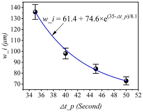 Figure 9 shows the EDS images and line distributions of alloy elements in specimens for different pouring time intervals. EDS images show different regions for each specimen: the low alloy steel region, the interfacial region, and the high chromium cast iron region. The element diffusion would occur when the concentration difference exists between the two regions. Additionally, diffusion would become more obvious as the temperature and concentration difference increase. The contents of Cr, Mo, and C in HCCI are significantly higher than that in LAS, as Table 1 listed. Thus, these elements diffused from the HCCI side to LAS. However, the absolute content is low at 2.11 wt.% for Mo and 2.73 wt.% for C. In fact, the determination of the C content has low accuracy for ESD. Apart from Cr content, the concentration difference in the solvent element Fe between the two sides is also remarkable and can be easily detected. So, obvious changes in both the contents of Cr and Fe can be detected and shown. Observed drastic changes in elements of Fe, Cr and C in the HCCI side result from inhomogeneity and carbide precipitation. Element distribution results show the gradual changes in the content of elements, especially Fe and Cr, in the interfacial region. Therefore, the interfacial width of dual-liquid cast bimetals can be inferred by measuring the line distribution of alloy elements. Combining the EDS images and corresponding line distributions of alloy elements, the interfacial widths for different pouring time intervals can be obtained and are listed in Table 2. From the width results, it is obvious that the interfacial width decreases with an increasing pouring time interval. The maximum interfacial width is 136 μm for specimen S1, and the minimum interfacial width is 73 μm for S4. So, the interfacial width decreases with an increasing pouring time interval. The variation in the interfacial width obeys the diffusion laws. That is, the diffusion distance increases with temperature and time. Both the temperature of the first casting and the diffusion time decrease with an increasing pouring time interval. So, the diffusion distance, namely w_i here, decreases with an increasing pouring time interval. Similar results have also been shown in previous publications [,,]. Based on four-point experimental w_i values in Table 2, the fitting relevant equation of interfacial width to pouring time intervals, w_i = f(∆t_p), is obtained through mathematical regression and is shown in Figure 10.