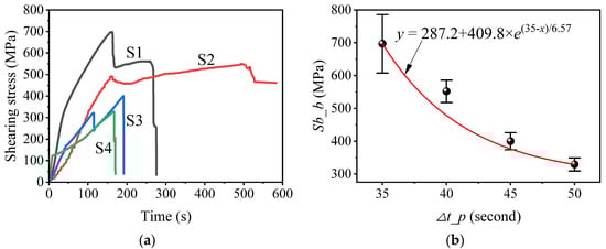 Shearing test results of bimetallic specimens produced using different pouring time intervals are shown in Figure 11. From the shearing stress vs. test time curves (Figure 11a), the shearing strength, that can characterize the interfacial bonding strength, of different specimens can be determined. Thus, the interfacial bonding strength of specimens S1 to S4 is, respectively, 697 MPa, 552 Mpa, 400 Mpa, and 329 Mpa. The pouring time interval dependence on the interfacial bonding strength of the LAS/HCCI bimetal is also fitted via mathematical regression based on values of interfacial bonding strength for those four samples and results are shown in Figure 11b. The difference between the interfacial bonding strength of different specimens is mainly because of the variation in interfacial width. Previous publications [,,] indicated that the interfacial bonding strength of bimetals depends on their interfacial width in a certain range. According to the results of Section 3.2.1, the interface width decreases with an increasing pouring time interval. Thus, the interfacial bonding strength decreases with an increasing pouring time interval. Although the interfacial bonding strength increases with the decreasing pouring time interval, a too-short pouring time interval causes the excessive mixing between pairs of bimetals and unstable quality of bimetallic hammerheads, according to actual products and simulation solidification results (see Section 3.2.1). Thus, a pouring time interval of 40 s yields a high interfacial bonding strength, suitable mixing layer, and stable product quality.