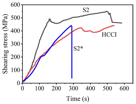 The typical shearing stress–time curves of the bimetallic and HCCI samples are shown in Figure 12. Where the S2 is the sign of the bimetallic specimen produced for the pouring time interval of 40 s with the addition of the interfacial protective agent, S2* is that without adding the interfacial protective agent. Both curves of S2 and HCCI have obvious yielding. However, the sample S2* fractured before yielding. The low yield shearing stress is about 455 MPa for S2, and 390 Mpa for S2* and HCCI. There is a remarkable working hardening and plastic deformation in the curve of S2, but this is inapparent for S2* and HCCI. The maximum shearing stress is approximately 552 Mpa for S2, and 444 Mpa for HCCI. Thus, the bimetallic hammerhead casting with the addition of an interfacial protective agent has higher yield shearing stress, maximum shearing stress, and plastic deformation ability than both the bimetal without the added agent and HCCI. This means that the interfacial bonding strength is 552 Mpa for S2 and 390 Mpa for S2*. An increase of approximately 41.5% in thse interfacial bonding strength is realized after adding the interfacial protective agent. The obvious increase in bonding strength for S2 originates from the cleaning effect and oxidation avoidance of the interfacial protective agent []. This interfacial bonding strength of 552 Mpa for S2 is higher than 315 Mpa for a hot diffusion compress bonded HCCI/LCS (low carbon steel) bimetal [], but is similar to the surface liquid-phase sintered HCCI/LCS bimetal []. The key reasons should be the suitable interfacial width and clean interface without oxidation.