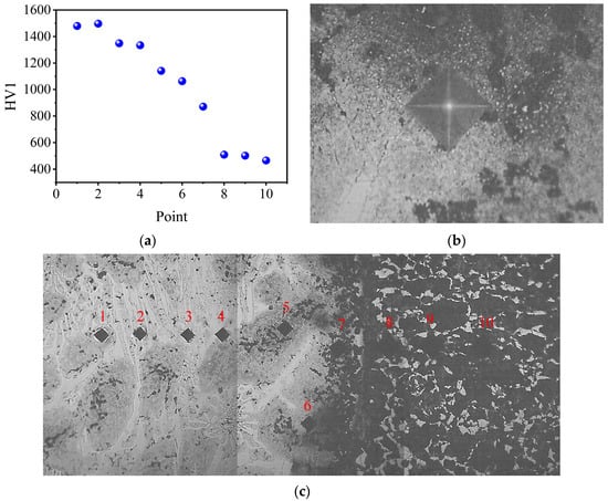 The hardness near the interface of specimen S2 was also tested. The hardness results and corresponding indentations are shown in Figure 15. The HCCI has a high hardness of about 1500 HV1. Additionally, the hardness of the LAS is approximately 500 HV1. Through the interface area, the hardness decreases gradually rather than plunges sharply. This phenomenon is very common in previous publications [,,,]. The diffusion of elements Cr, C, and Mo from the HCCI side to LAS is the key reason for the decrement in the hardness. Element diffusion from HCCI to LAS increases the content of solute elements gradually in the interfacial region. The increased solute content can realize solid solution strengthening. Additionally, the increased solution content would induce carbide precipitation that can also enhance the hardness. Test Point 6, which is located in the interfacial region, shows a clear indentation. Previous works [,,] indicated that the indentation of a hardness test can characterize the ductility of metals and alloys. The more and/or longer cracks appear, the worse the ductility of metals is. No cracks can be found around the corners of the indentation of Point 6, as Figure 15b shows. This means that the interfacial region of the cast hammerhead has good ductility.