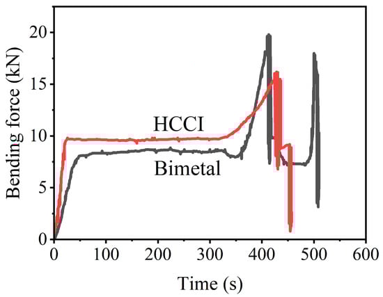 The bending force–time curves of the bimetal and HCCI are shown in Figure 16. The maximum bending force is 19.78 kN for the bimetal and 16.11 kN for HCCI. That is, the bending strength is 1188 MPa for the bimetal and 972 Mpa for HCCI. The high bending strength may be because of the energy consumption and working hardening of the LAS. The bending strength of bimetallic samples in this work is far higher than that of high-Cr white cast iron and AISI4140 steel bimetallic beams (650 to 790 Mpa) []. The fracture behavior between the bimetal and HCCI samples is also different from each other. The HCCI breaks immediately after the maximum force. However, a second increase in bending force is needed before fracturing the bimetal. This also proves that the fracture of the bimetal needs more external energy than HCCI.