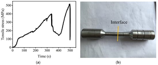 Tensile stress vs. time curve (a) and a fractured sample photo (b) of the bimetal.