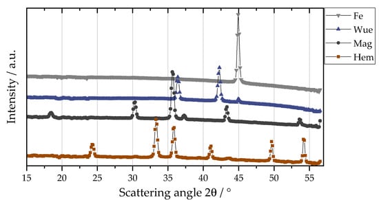 The intensity ratio method for X-ray powder diffraction is a well-known method of quantitative phase analysis [31,32,33] that has also been adapted for WAXS. Scattering curves of multiple binary mixtures of pure materials are measured, and a linear regression model for peak intensity ratio as a function of the weight fraction ratio is determined. The pure materials used in this publication are carbonyl iron powder (>99.5%, PMCtec GmbH, Leun, Germany; see Section 2.5), iron(II) oxide (10 mesh; ≥99.6% trace metal basis, Sigma-Aldrich, St. Louis, MO, USA), iron(II,III) oxide (<5 μm, 95%, Sigma-Aldrich, St. Louis, MO, USA) and iron(III) oxide (<5 μm, 96%, Sigma-Aldrich, St. Louis, MO, USA). For better readability, the oxide states are abbreviated below with the corresponding mineral names, i.e., Fe (iron), Wue (wuestite, iron(II) oxide), Mag (magnetite, iron(II,III) oxide) and Hem (hematite, iron(III) oxide). In Figure 2 the wide-angle scattering curves of the pure materials are shown. The chosen characteristic Bragg reflection peaks of the materials are located at a scattering angle, 2θ, of 30.36° for iron(II,II) oxide (220) [34], 33.17° for iron(III) oxide (104) [35], 41.66° for iron(II) oxide (200) [36] and 44.69° for α-iron (110) [37]. The peaks were fitted with a Pseudo-Voigt profile using Profex 5.1.1 [38]. For a binary mixture of two materials, A and B, the relationship between the peak intensity ratio, IA/IB, and weight fraction ratio, XA/XB, is