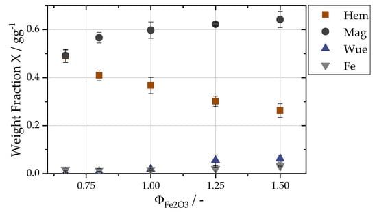 Figure 3 shows an exemplary WAXS curve of oxidized particles from the first separation stage for a fuel–air equivalence ratio of 1.5. All characteristic Bragg peaks can be assigned respectively to iron(III) oxide, iron(II,III) oxide, iron(II) oxide or α-iron, showing that the sampled iron oxide particles consist only of various iron oxide and pure iron phases. Based on the relative intensity ratios, the relative phase contents have been calculated using the WAXS-calibration method. The results of increasing the fuel–air equivalence ratios. , are depicted in Figure 4. The iron(III) oxide content decreases steadily from 0.49 ± 0.03 to 0.26 ± 0.03 for richer mixtures, whereas the iron(II,III) oxide content increases from 0.49 ± 0.03 to 0.64 ± 0.03. The residual iron content is highest for fuel-rich flames with 0.03 and then decreases to values of around 0.016. The steady increase for the higher oxidized phases with decreasing equivalence ratios, , shows that lean flames yield a better degree of oxidation.