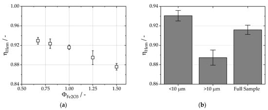 The calculated fuel usage efficiencies increase from 0.88 to 0.93 for leaner atmospheres with decreasing fuel–air equivalence ratios. The main influence to ensure high efficiency is minimizing residual iron content in the oxidized particles. Particle size was also identified to have a significant effect, as larger fractions were oxidized to a lesser degree than smaller fractions. To achieve almost full oxidation, the maximum particle diameter of the carbonyl iron particles should, therefore, be limited. Furthermore, Li et al. [17] reported an increased frequency of microexplosions for larger particles of up to 100 μm, providing an additional reason to keep particle sizes small. On the other hand, the minimum particle size should also be limited due to an increased risk of spontaneous ignition [47], increased effort for separation [48] and general challenges in solids handling, e.g., agglomeration, low packing density and powder flowability.