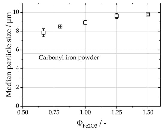 Median particle size of the iron oxide particles for different fuel–air equivalence ratios, . The median of the carbonyl iron powder is included as a straight line for reference.