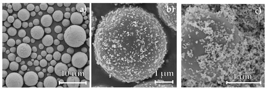 SEM images of the sampled iron oxide particles after combustion at different resolutions, (a) and (b), in the first separation stage and (c) in the second separation stage for a fuel–air equivalence ratio of 1. The particles in the first separation stage are spherical, exhibit multiple cracks and holes on the surface and are covered by fine nanoparticles adhering to the surface. In (c), the separated nanoparticles show a smooth surface as well as a spherical morphology.
