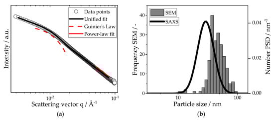 (a) Small-angle X-ray scattering curve of the iron oxide nanoparticles. The original scattering data have been fitted (with local Guinier and power-law fits) using a unified fit approach. Guinier’s law yields a prefactor of 413.27 with a radius of gyration of 22.6 nm. The evaluation of the power-law fit delivers an exponent of −4 and a prefactor of 5.58·10−7. (b) Particle size distributions of the nanoparticles. Both distributions have a geometrical standard deviation of 1.37. For the SEM distribution, 300 particles have been counted.
