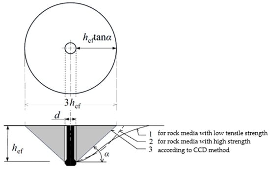 Formation of the failure zone of the medium under the action of the undercutting anchor, where: d—diameter of anchor hole, hef —effective anchor depth, and α—angle of failure cone according to CCD method (α = ~35°).