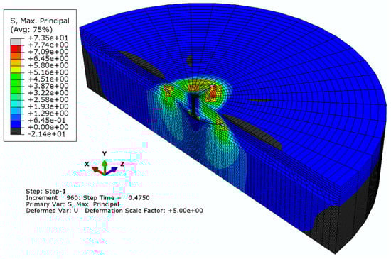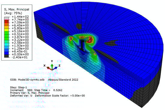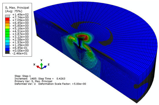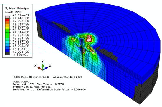 Elements with a global linear dimension of 14 mm were used; radially, the size of the elements increases outward starting from 5 mm to 30 mm. The number of elements on the half-diameter of the model was 22. The characteristics of the finite element mesh of the model were as follows: the number of nodes—28877 and the number of elements—26086. The result of the simulation (the distribution of maximum stress (max) and the trajectory of the crack) is illustrated in Figure 5.