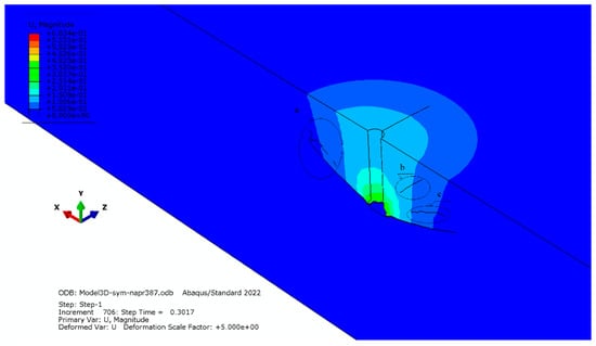 Figure 11a,b show the distribution of resultant displacements in the failure zone and the resulting outline of the failure zone (the so-called failure cone). It can be seen from these figures that the largest displacements of the rock medium occur at the periphery of the anchor hole and decrease along the radius of the model. In addition, the appearance of a radial crack was noted in a plane almost perpendicular to the plane of symmetry of the model.