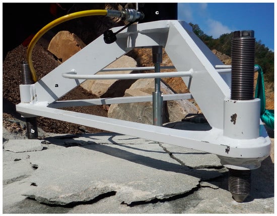 Field tests were carried out at the “Braciszów” and “Zalas” mines [], among others, using a dedicated mobile measuring station to pull out the anchors. The stand consisted of a frame with a socket for attaching a hydraulic cylinder (Figure 17), which was supported at three points; a hydraulic cylinder; a hydraulic pump with a pressure sensor; and a measuring computer.