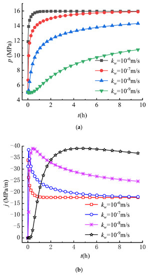 The hydraulic conductivity is an important factor not only in studying the characteristics of fluid flow, but also in the analysis of the stress field during hydraulic fracturing [47]. To investigate the variations of circumferential stress fields under different permeability conditions, the hydraulic conductivity employed in analysis is set as 10−9 m/s, 10−8 m/s, 10−7 m/s and 10−6 m/s, respectively.