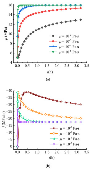 Figure 12a,b show the effect of viscosity on the variations of pore pressure and seepage force at r = 0.25 m. The pore pressure increases over time until reaching a steady state, where the larger the fluid viscosity, the slower the increase rate of pore pressure. Meanwhile, the larger the fluid viscosity, the more slowly the seepage force reaches a steady state. As a result, the effect of viscosity on the pore pressure and seepage force is opposite to that of the hydraulic conductivity. Thus, the effect of viscosity on and is also opposite to that of the hydraulic conductivity as shown in Figure 12c,d, i.e., the larger the fluid viscosity, the more slowly and decrease. It can be found that the lower the fluid viscosity, the faster the tensile failure of rock occurs because decreases more quickly over time. These results can well-explain the reason that the lower breakdown pressure is observed in the experiments using fluids with lower viscosity (such as liquid CO2) as fracturing fluids [30,31].