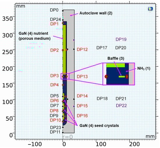 Geometry of the model with location of domain point probes (see Table 2 for coordinates thereof and for a description of the chosen locations). The color coding of the labels is as follows: probes in the fluid (red), probes in solids (black and purple), and probes at the location of control thermocouples in an experimental setup (purple). The components are also labeled, including a number that refers to the material (see Table 3, Table 4 and Table 5 for further information on materials).