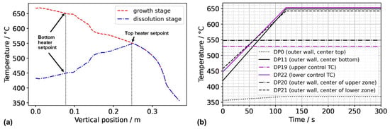 (a) Thermal boundary conditions imposed along the vertical outer wall of the autoclave for Model 550_650 (growth stage) and Model 550_450 (dissolution stage of the growth experiment). (b) Temperatures at domain probes located at the outer wall over time. The abbreviation TC stands for thermocouple, referring to the position thereof in the experimental setup.