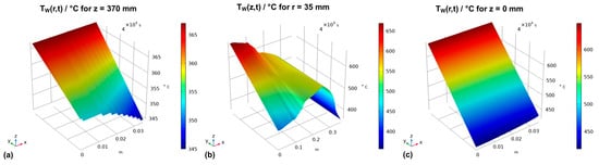 The boundary conditions were based on the temperature profiles extracted from the previous study and defined as a function of coordinates, the time t, and the duration of the set temperature inversion process as follows. For the upper outer autoclave wall (z = 370 mm), the thermal boundary conditions were defined by the function in Equation (15):