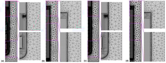 The parameters used to create the mesh are given in Table 6. Four boundary layers with a stretching factor of 1.2 were employed at the interface of the fluid with the autoclave walls, baffle, and seeds, respectively. The thickness of the first boundary layer was set to 0.02 mm. The relative tolerance was set to 0.002 for Model 550_650, whereas a relative tolerance of 0.050 was applied for the inverted temperature Model 550_450 to facilitate convergence. The convergence difficulties observed when initially using the same relative tolerance are thought to be due to the less accurate estimation of thermal boundary conditions in the case of the inverted temperature version of the Model 550_450.