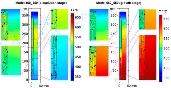 At the dissolution stage (left subfigures of Figure 5 and Figure 6) as well as at other times investigated, the temperature distribution is relatively uniform within the nutrient, whereas a noticeable thermal gradient is observable along the vertical direction throughout the growth zone and more generally, in the major free flow regions. This suggests that those thermal gradients are related to convective heat transfer and, consequently, to the flow field. At the top of the autoclave, a smaller flow cell develops, which extends into the upper third of the nutrient and exhibits an upward flow at the center and a downward flow near the vertical autoclave wall. Within the remaining part of the nutrient height, a larger flow cell develops, which exhibits downward flow inside the nutrient and upward flow in the gap between the nutrient and autoclave wall. A circular flow cell is found around the baffle, i.e., the downward flow through the center changes its direction already in the vicinity of the baffle and joins an upward flow passing through the gap between the baffle and autoclave wall. This is likely related to the upward flow near the center that is observed in the growth zone and probably originates from the cold wall in the growth zone at the dissolution stage.