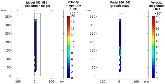 The velocity magnitudes at the dissolution stage are below 0.007 m/s, with much lower velocity magnitudes in most regions (see Figure 6 and Figure A1). Only in the uppermost region within and especially above the nutrient, velocity magnitudes comparable to those at the growth stage are found. This is expectable because the nutrient zone has a higher temperature than the top of the autoclave, and therefore, a driving force for natural convection exists in the uppermost part of the autoclave. The temperature of the growth zone, however, is lower than that of the nutrient region above, and therefore there is no local driving force to cause pronounced natural convection within the growth zone at the dissolution stage.