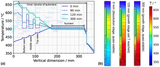 (a) Temperature distribution along the centerline for selected points in time. The data labeled with 0 min correspond to quasi-stable conditions at dissolution stage, whereas the data labeled with 120 min correspond to the time at which growth stage set temperatures were reached. The data labeled with 300 min correspond to the time at which quasi-stable conditions at growth stage were reached. The time t = 90 min is also shown, as it represents the time at which all seeds and nutrients have nearly the same temperature. (b) Temperature distribution with isotherms for quasi-stable dissolution stage conditions (0 min), at the end of set temperature change (120 min), and for quasi-stable conditions at growth stage (300 min). The temperature difference between isotherms is 10 K, and the range of temperatures is 330 °C to 670 °C.