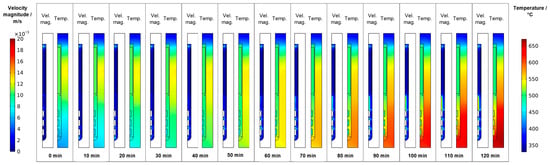 Velocity magnitude and temperature fields occurring during set temperature change for temperature inversion (0 min: quasi-stable etch-back condition, 120 min: reaching of growth stage set temperatures).