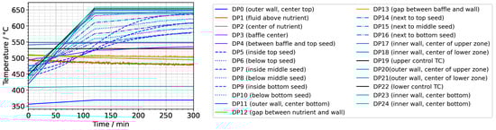 For all domain probe locations, the resulting temperatures plotted over time are presented in Figure 9. Significant short-term fluctuations are visible for DP1 (at the center halfway between the top of the nutrient and the top inner wall) and DP13 (in the gap between the baffle and autoclave wall). Note that the temperature data for DP3 (in the center of the center hole of the baffle) are hidden by the data of DP13 but exhibit significantly fewer short-term fluctuations, similar to DP4 (between the baffle and top seed in the center). At present, it is not entirely clear whether the oscillations in temperatures in the gap regions represent a physical effect or whether numerical artifacts related to the mesh in this narrow region play a noticeable role. The absence of significant temperature fluctuations for the other domain probes deviates from previously published experimental results of one of the authors [], which is, however, explainable due to significant differences in the experimental setup and procedures. Firstly, the experimental setup used in that previous study [] contained a much smaller volume fraction of solids in the nutrient zone, which represented much less of an obstacle to natural convection. Secondly, the control thermocouples in that setup were located inside the furnace insulation and consequently without thermal contact with the outer autoclave wall (contrary to the here-considered setup). In the previous experimental study [], fluctuations in autoclave wall temperature (that is, thermal boundary conditions) may therefore have occurred due to possible oscillations in heater powers.