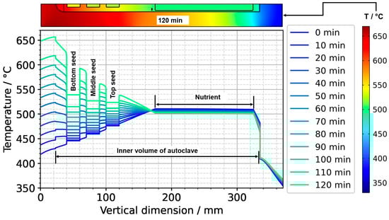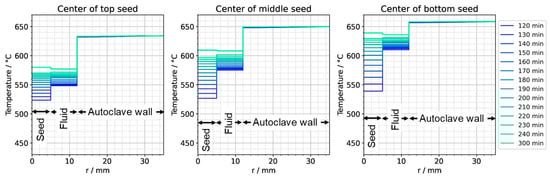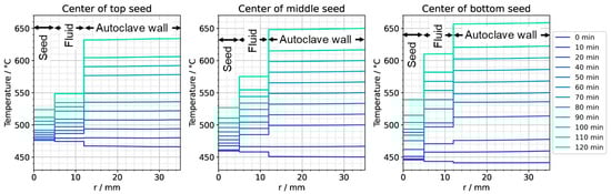 To further ease quantitative interpretation at various times of the set temperature inversion process, a vertical temperature profile along the centerline of the autoclave is presented in Figure 10 for the respective times. Horizontal temperature profiles through the center of each seed are presented in Figure 11. At quasi-stable etch-back condition (0 min), the temperature of each seed is an average of the temperatures of the surrounding fluid. Upon reaching growth stage set temperatures (120 min), that is, before re-establishing quasi-stable conditions, the temperatures of the seeds are significantly lower than the temperatures of the surrounding fluid: about 70 K for the bottom seed, 45 K for the middle seed, and 20 K for the top seed, respectively. On the contrary, the temperatures of the inner autoclave wall are significantly higher than the fluid temperatures: 48 K for the bottom seed, 74 K for the middle seed, and 80 K for the top seed, respectively. That is, the driving force for parasitic growth should be highest at the bottom of the autoclave, as well as the driving force for a possibly ongoing dissolution of the seed (if parasitic deposition temporarily leads to an undersaturated fluid there). The increasing amount of parasitic deposition towards the bottom of the autoclave is in line with typical experimental observations.