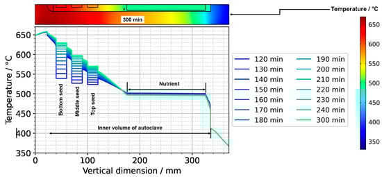 After the process of set temperature inversion is completed, it takes about 3 h for the system to reach quasi-stable conditions again. The respective temporarily occurring temperature distributions, as well as the one under quasi-stable conditions of the growth stage, are shown in Figure 12, alongside the quasi-stable growth stage temperature distribution. Expectably, the rates of temperature change decrease gradually as quasi-stable conditions are approached. After about 2 h, the seed temperatures become an average of the temperatures of the surrounding fluid (Figure 12 and Figure 13).